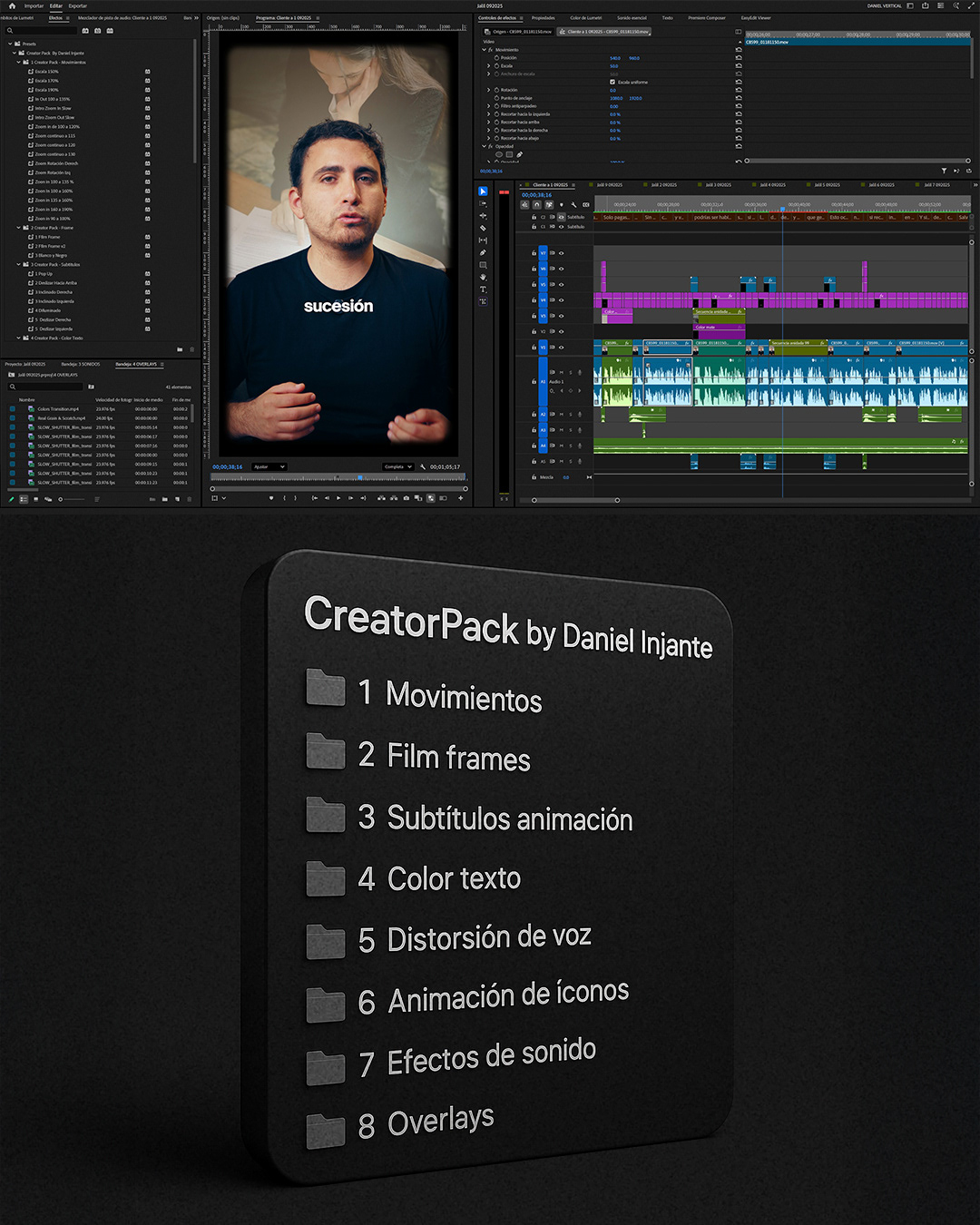 Te presento el Creator Pack para Adobe Premiere, una solución diseñada para quienes busquen y quieran agilizar el proceso de edición de videos de marca personal, de sus clientes .
